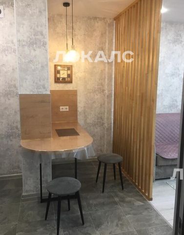 -- Зонированное пространство: кухня и спальное место разделены натуральной деревянной перегородкой;