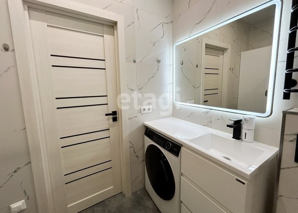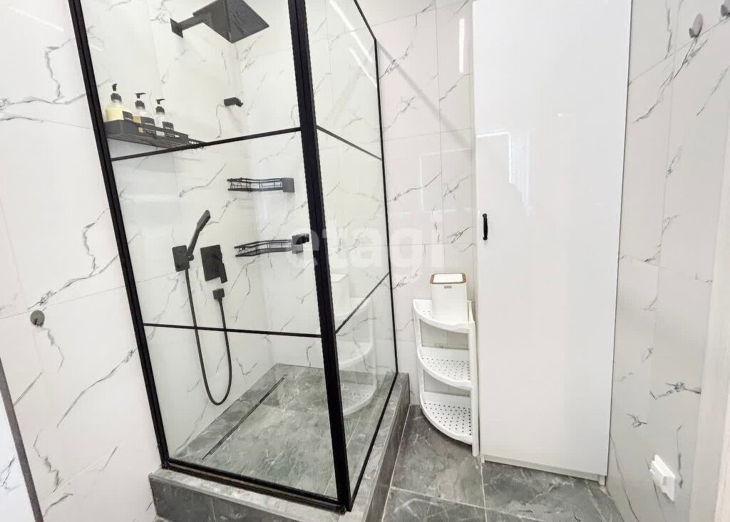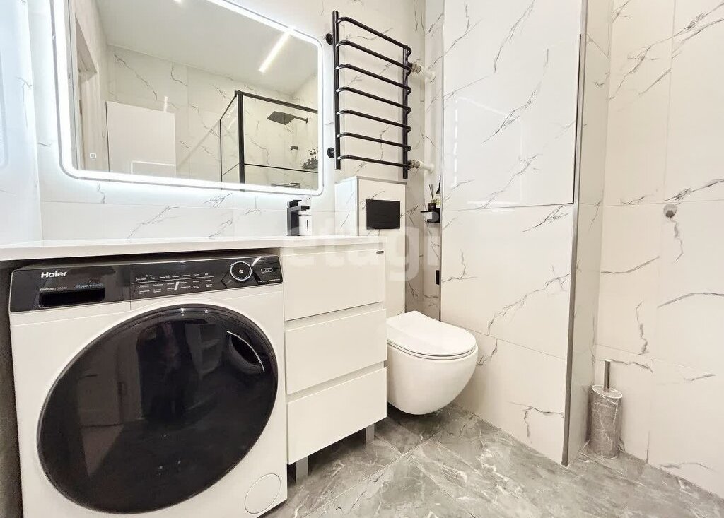 Совмещенный санузел с душевой, стиральной машиной и местами для хранения.