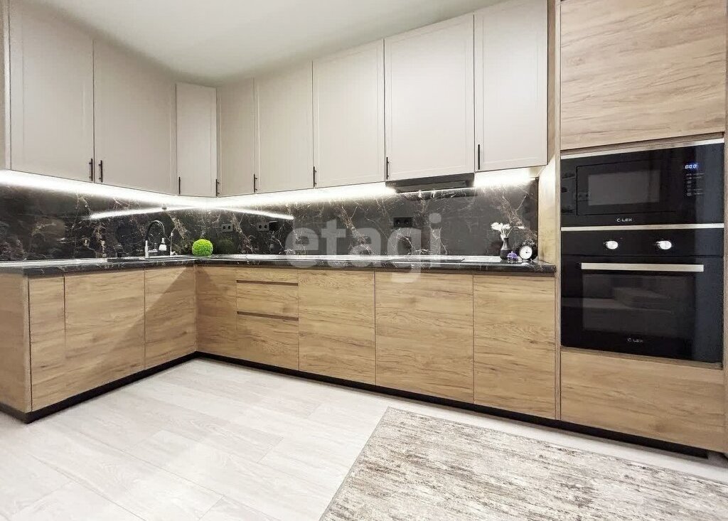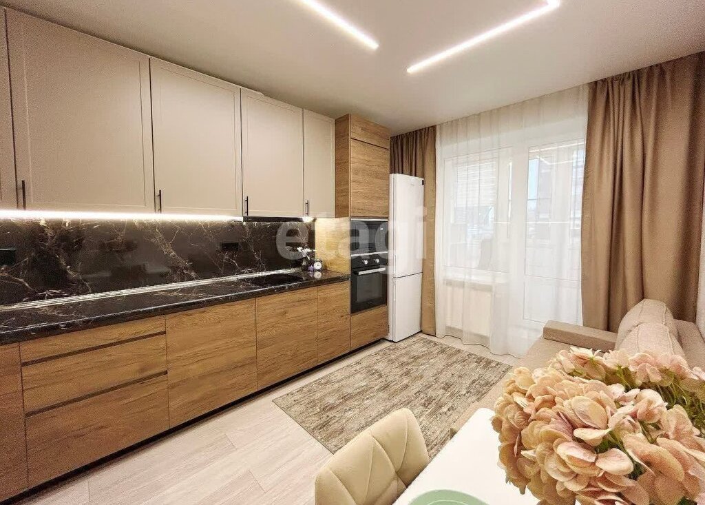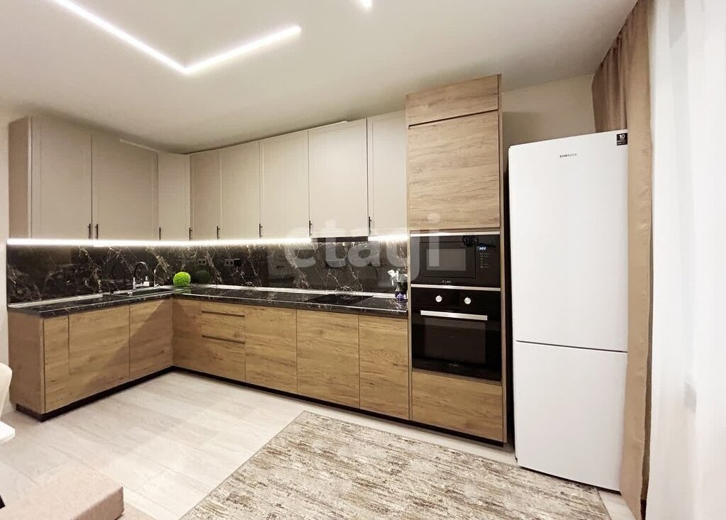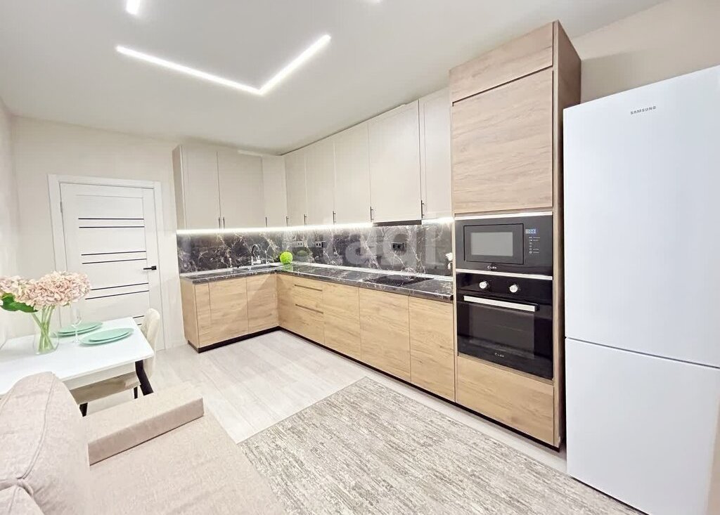 Просторная кухня-гостиная со встроенной техникой, обеденной зоной и зоной отдыха.
