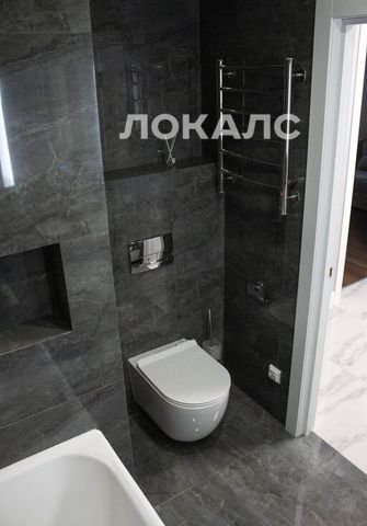 Ванная комната. Автоматическая вытяжка при включении света, функция «тёплый пол», ванная, электрическая сушилка, вшитая полка в стене, освещение от зеркала и общее, подвесной встроенный унитаз.