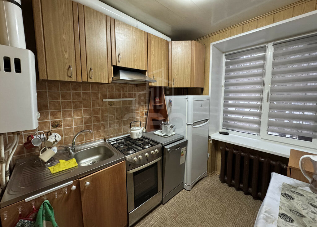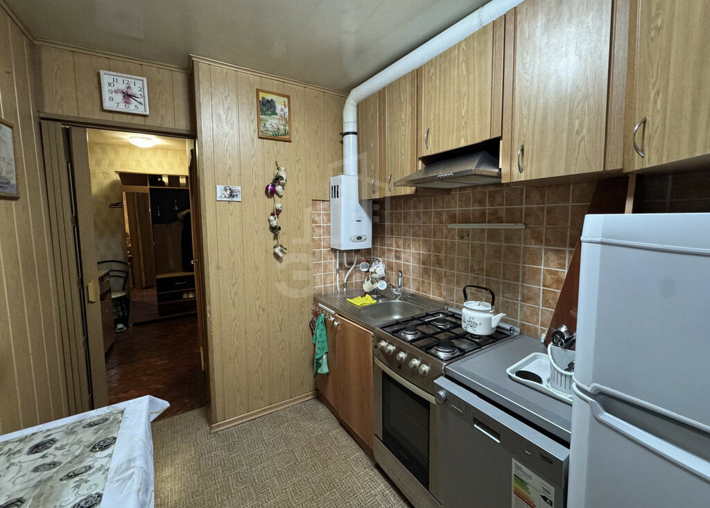 Кухонный гарнитур с газовой плитой и вытяжкой; микроволновая печь, холодильник и посудомоечная машина, обеденный стол.