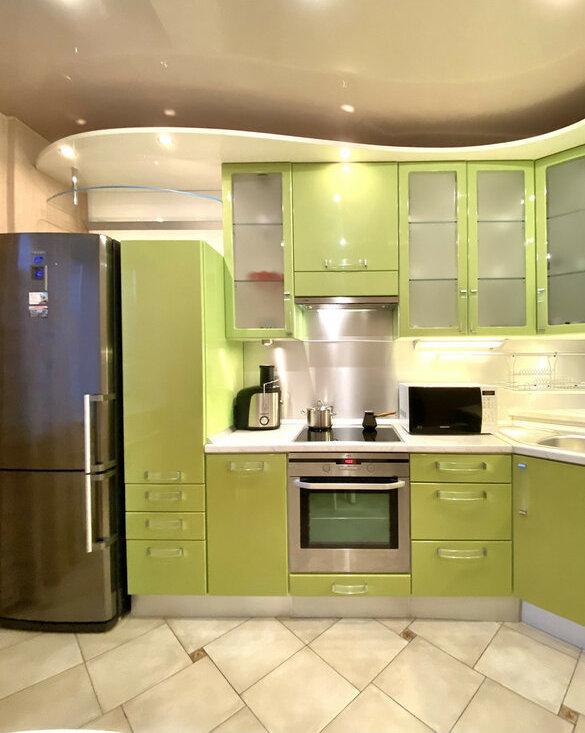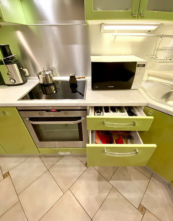 Техника: электр. чайник Bosch, вытяжка, микроволновая печь Samsung, стиральная машина Bosch., пылесос Electrolux, утюг, гладильная доска. Вся необходимая посуда.