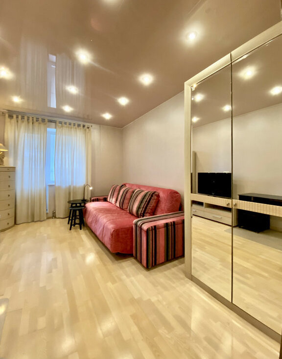 В комнате большой трехместный раскладной диван с ортопедическим матрасом, распашной шкаф, ТВ зона с телевизором, витринные шкафы, рабочая зона, журнальный столик с дополнительным освещением.