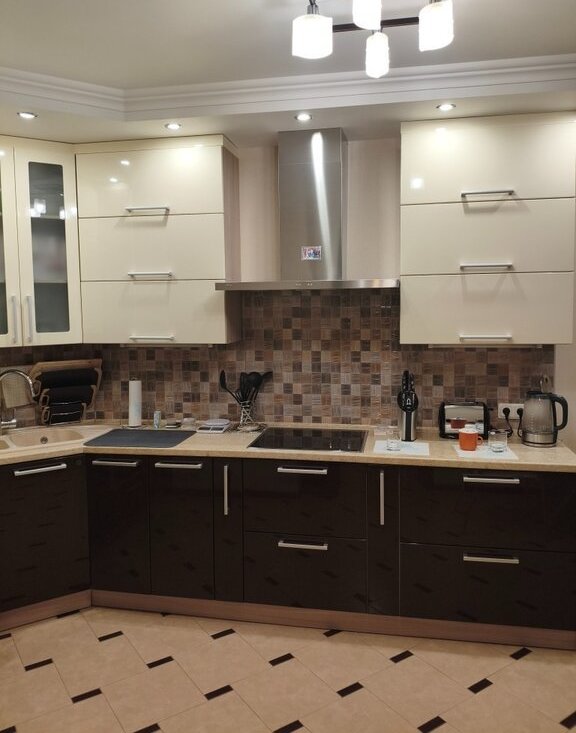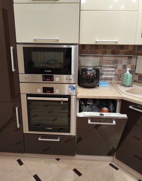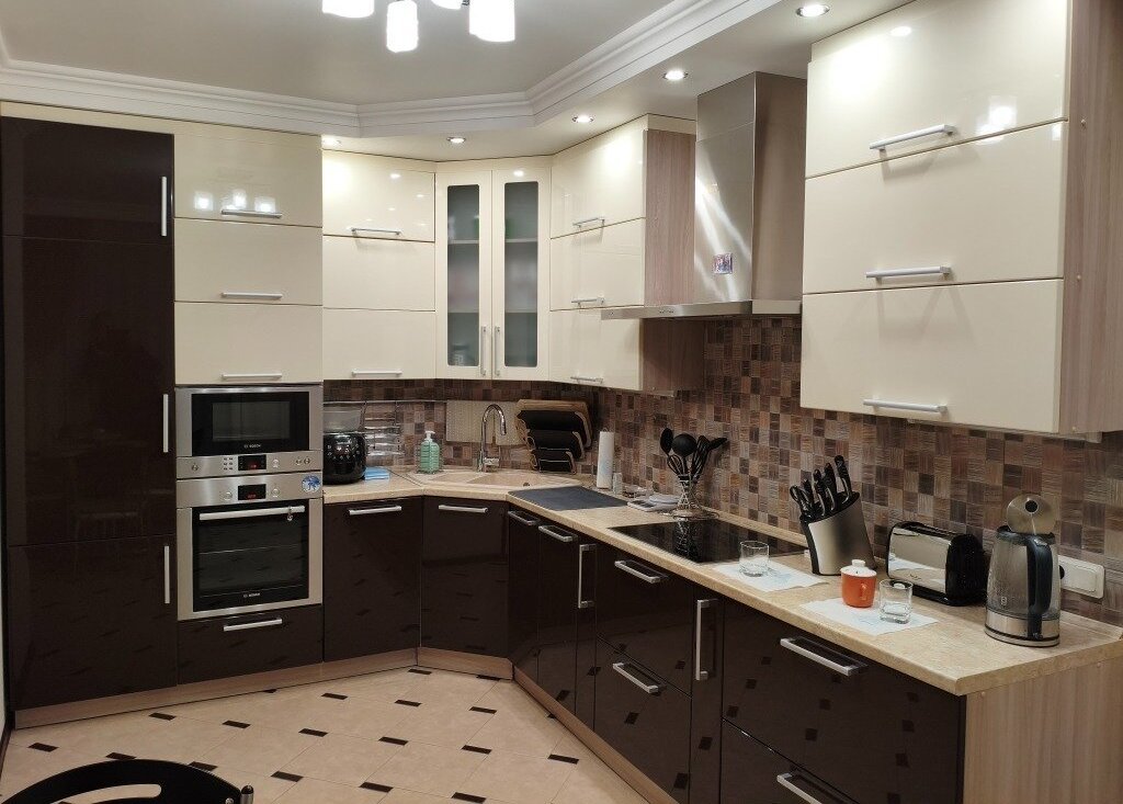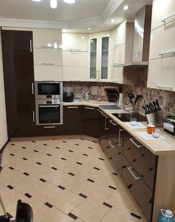 Современная угловая встроенная кухня. Полный набор бытовой техники.