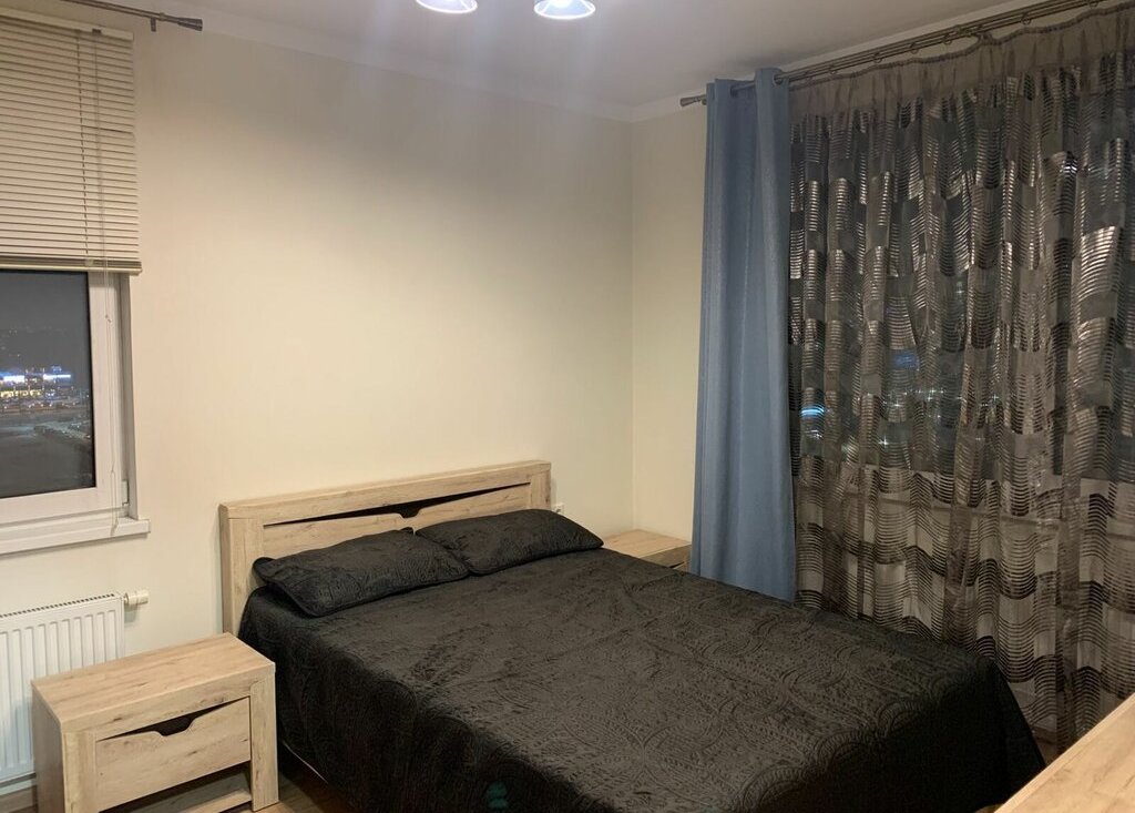 Удобная планировка: кухня-гостиная 14,2 кв.м. и спальня 13 кв.м., совмещенный санузел 4,6 кв.м. с окном на лоджию. Квартира с панорамным видом на город, четыре окна, выходят на северо-запад и юго-запад. Большая застекленная лоджия 7 кв.м. Современный ремонт. Полная меблировка квартиры.