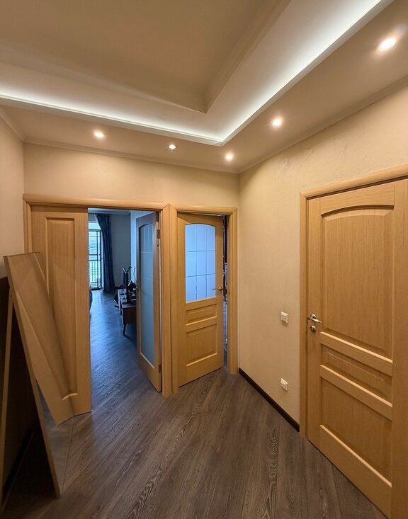 В квартире выполнен ремонт с использованием качественных материалов: натуральное деревянное напольное покрытие, двойные стеклопакеты, продуманная и безопасная электропроводка. В ванной и туалете установлен тёплый пол.