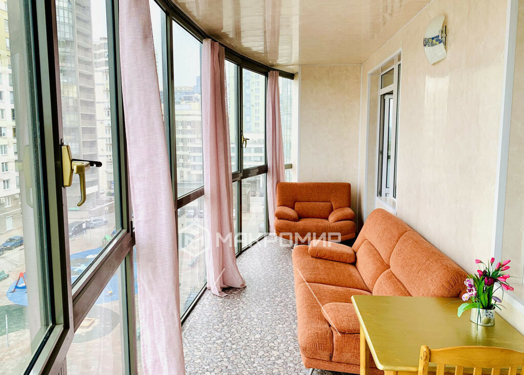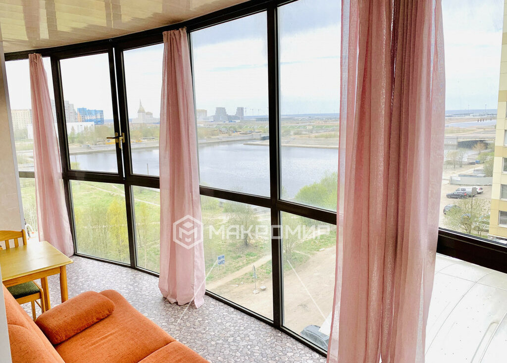 Главная фишка этого места — расположение. Окна выходят прямо на Финский залив, с застекленного балкона 11.6 м² открывается панорама на воду, пассажирский порт и набережную Смоленки.