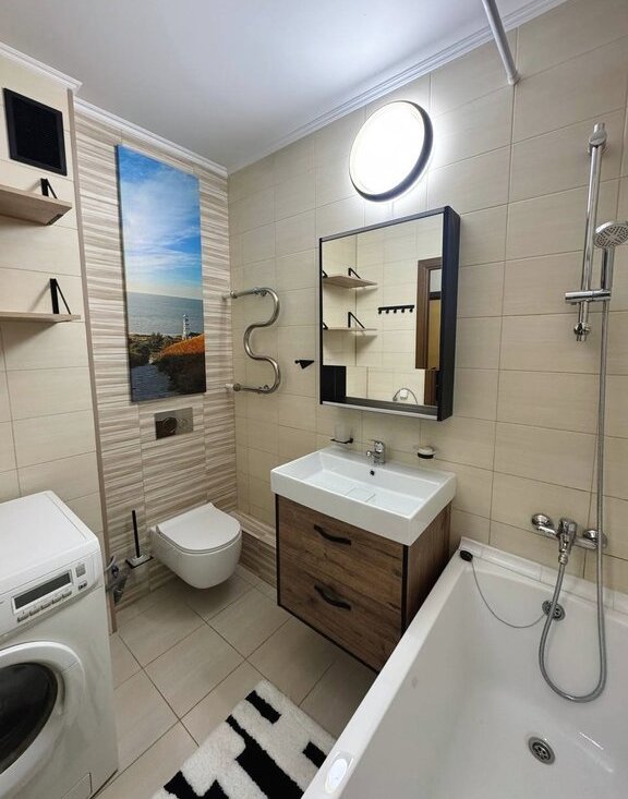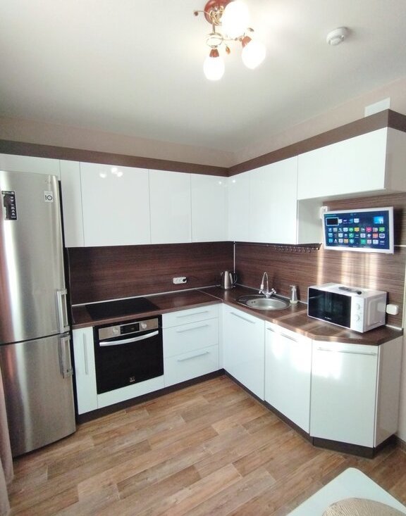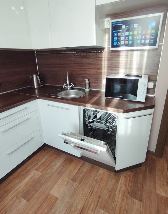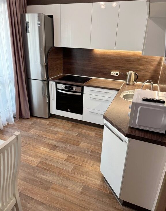 Квартира оборудована качественной мебелью и бытовой техникой, в том числе посудомоечной машиной BOSCH, духовым шкафом LG, стиральной машиной Electrolux с функцией сушки.