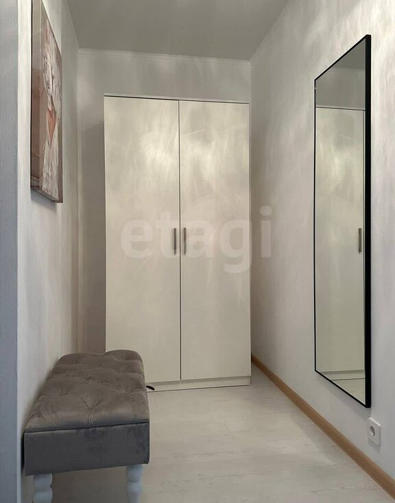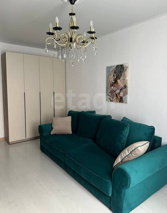 Квартира оформлена в современном минималистичном стиле с использованием нейтральных тонов. Просторная гостиная сочетает в себе комфорт и функциональность, располагая уютным диваном и стильным шкафом для хранения.