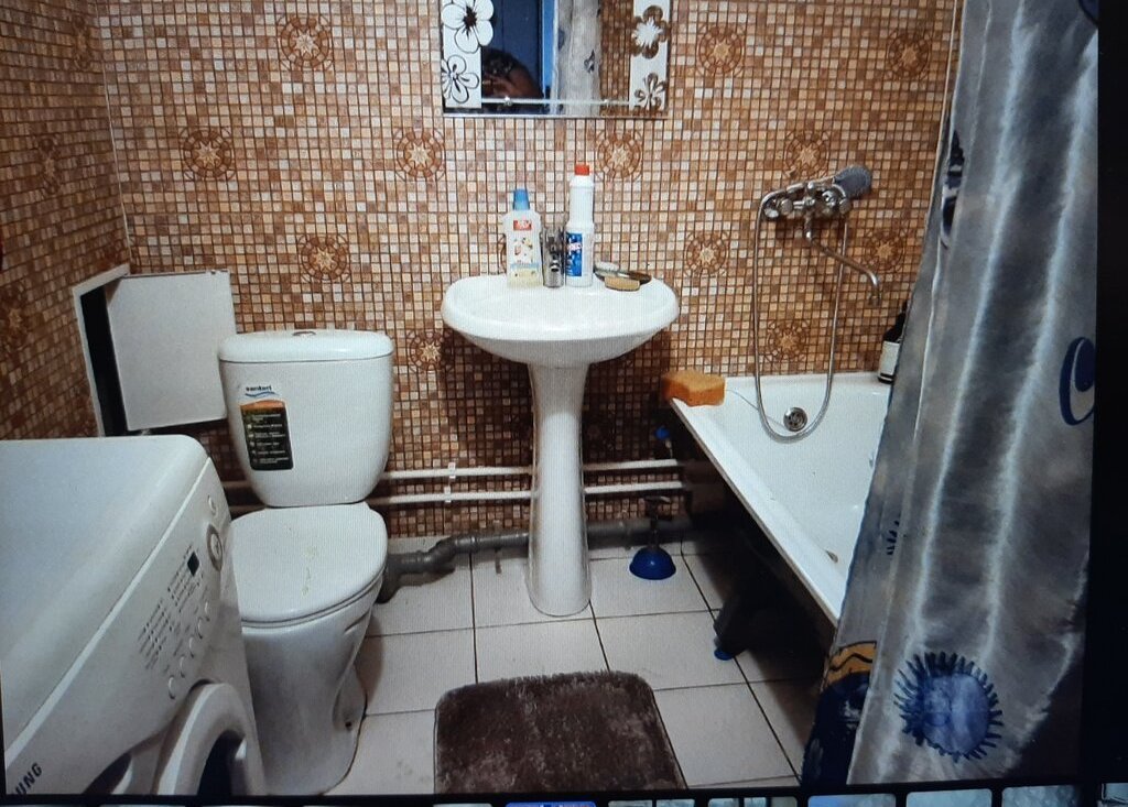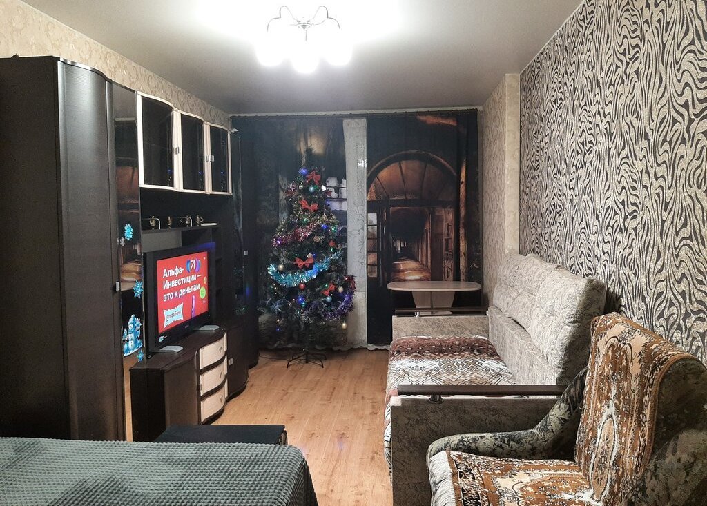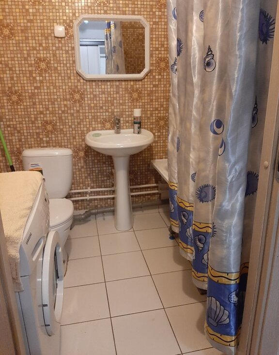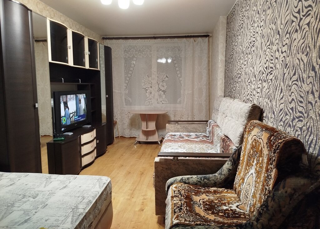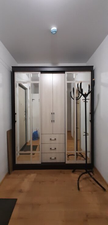 Комната: двуспальная кровать, раскладной диван, раскладное кресло, современная стенка, телевизор, стол, стул, пуф. В ванной стиральная машина на 6 кг. В прихожей два больших шкафа. Сушилка. Стеклопакеты во всей квартире.