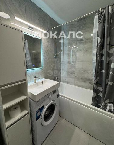В санузле: большая ванна, современная и новая сантехника, электрический полотенцесушитель с сенсорным управлением, стиральная машина, зеркало с подсветкой и функцией анти-пар, шкафчик для хранения. Все трубы аккуратно спрятаны.