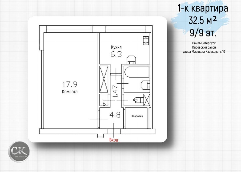 1-комнатная квартира: Санкт-Петербург, улица Маршала Казакова, 10к1В (32.5 м²)