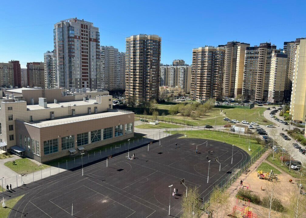 Во дворе детский сад, школа, детские и спортивные площадки.