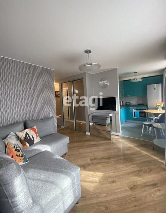 Планировка квартиры включает большую кухню-гостиную, изолированную спальню, совмещенную ванную комнату.