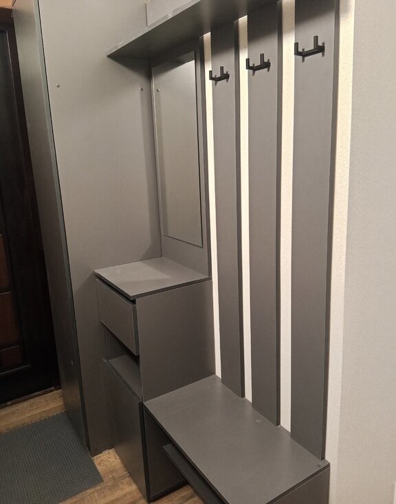 Мебель и техника: Установлена новая кухня с варочной панелью и холодильником. Имеется микроволновка. В комнате (17 м²) — вместительный четырехстворчатый шкаф, угловой диван и комод. В прихожей — встроенная мебель с зеркалом.