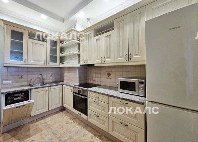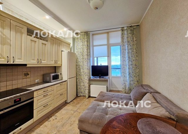 На кухне установлен встроенный гарнитур оборудованный духовым шкафом, варочной поверхностью, вытяжкой, посудомоечной машиной, СВЧ, холодильником. Обеденная группа. Очень удобный диван для отдыха, ЖК телевизор. Выход на застекленную лоджию с панорамным остеклением.