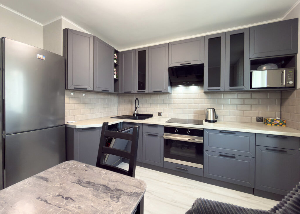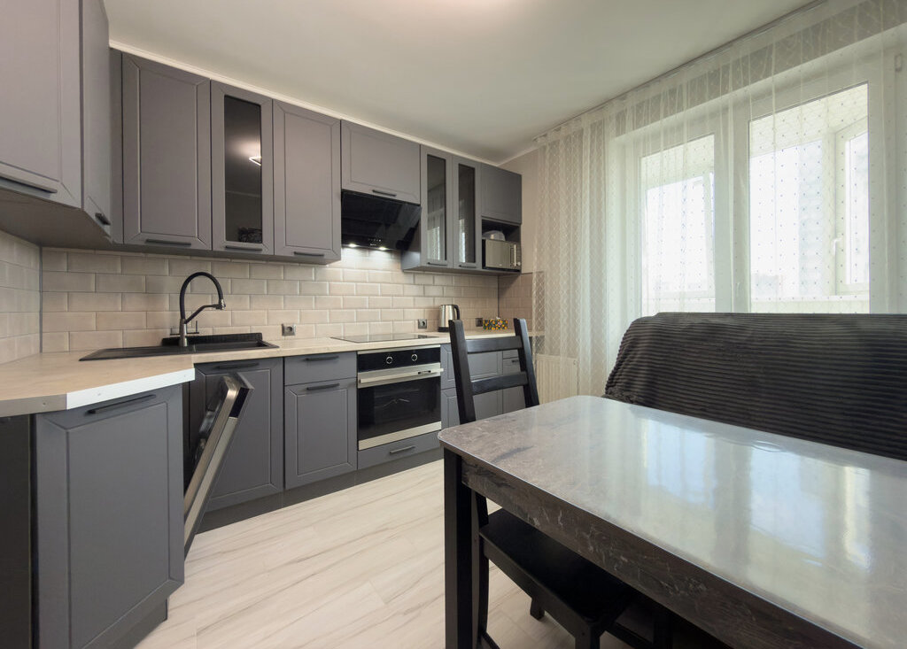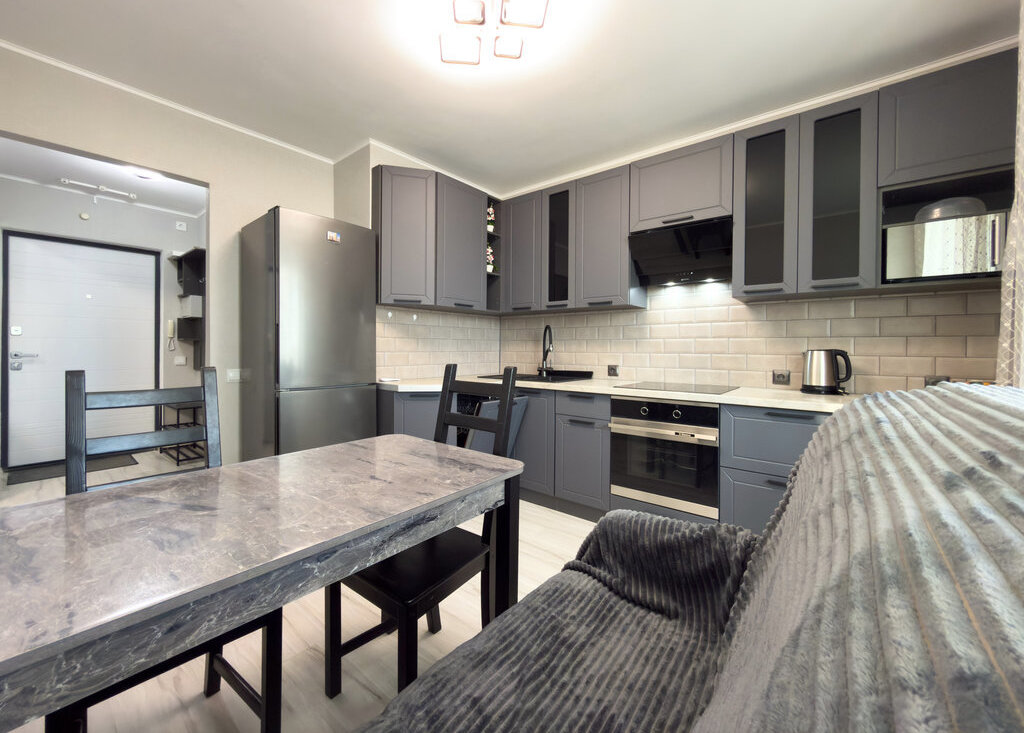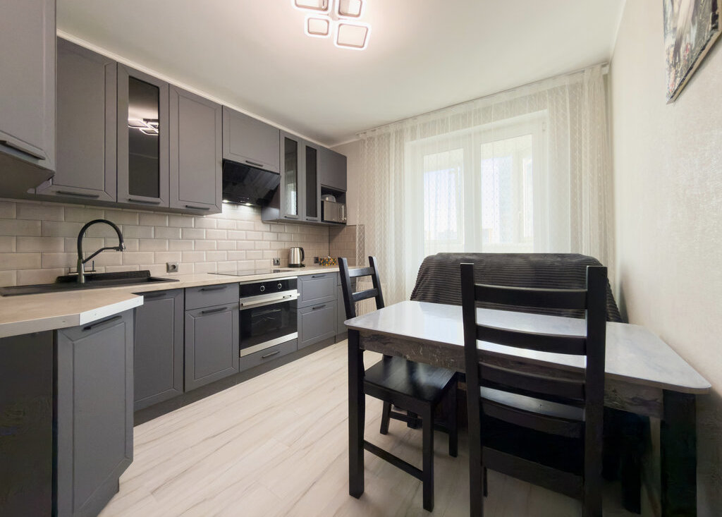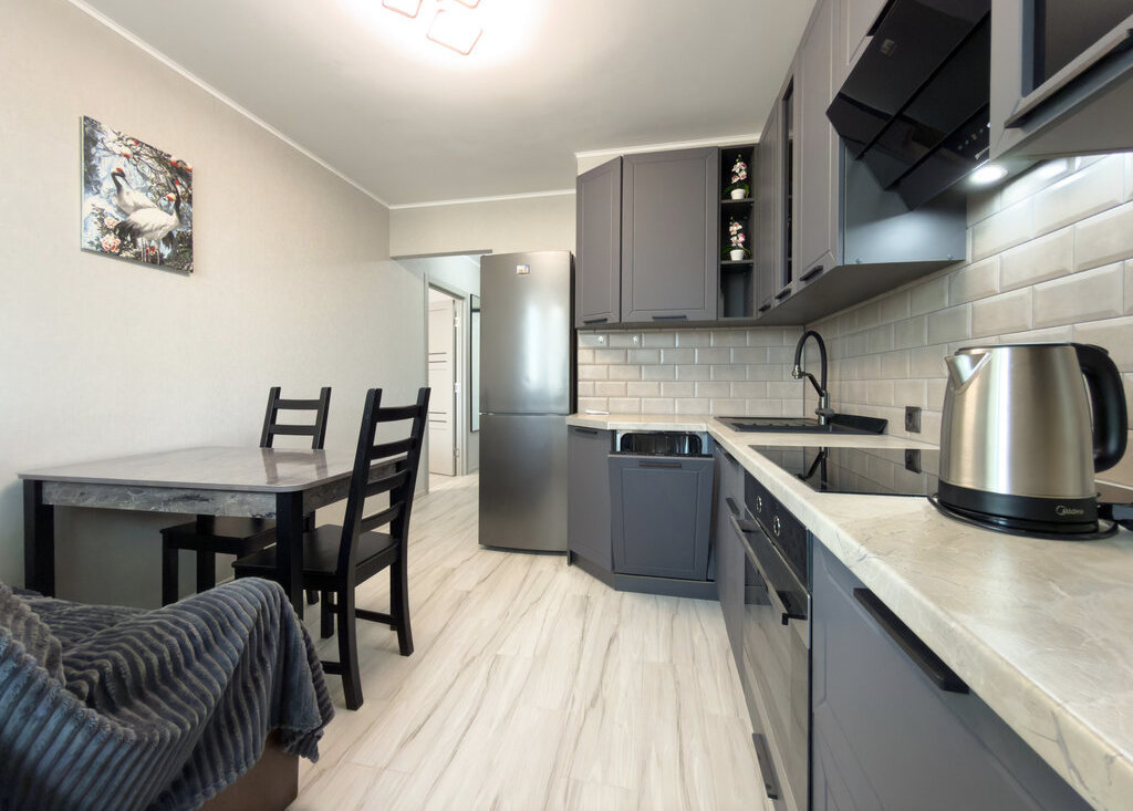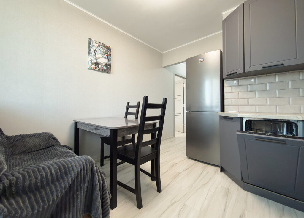 Встроенная кухня с новой бытовой техникой. Холодильник. Посудомоечная машина. Стол, стулья.