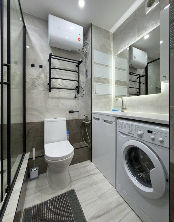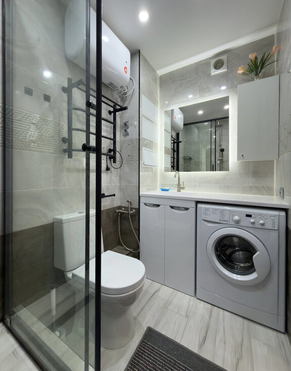 Ванная комната: Душевая кабина. Стиральная машина. Зеркало с подсветкой.