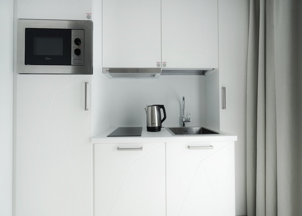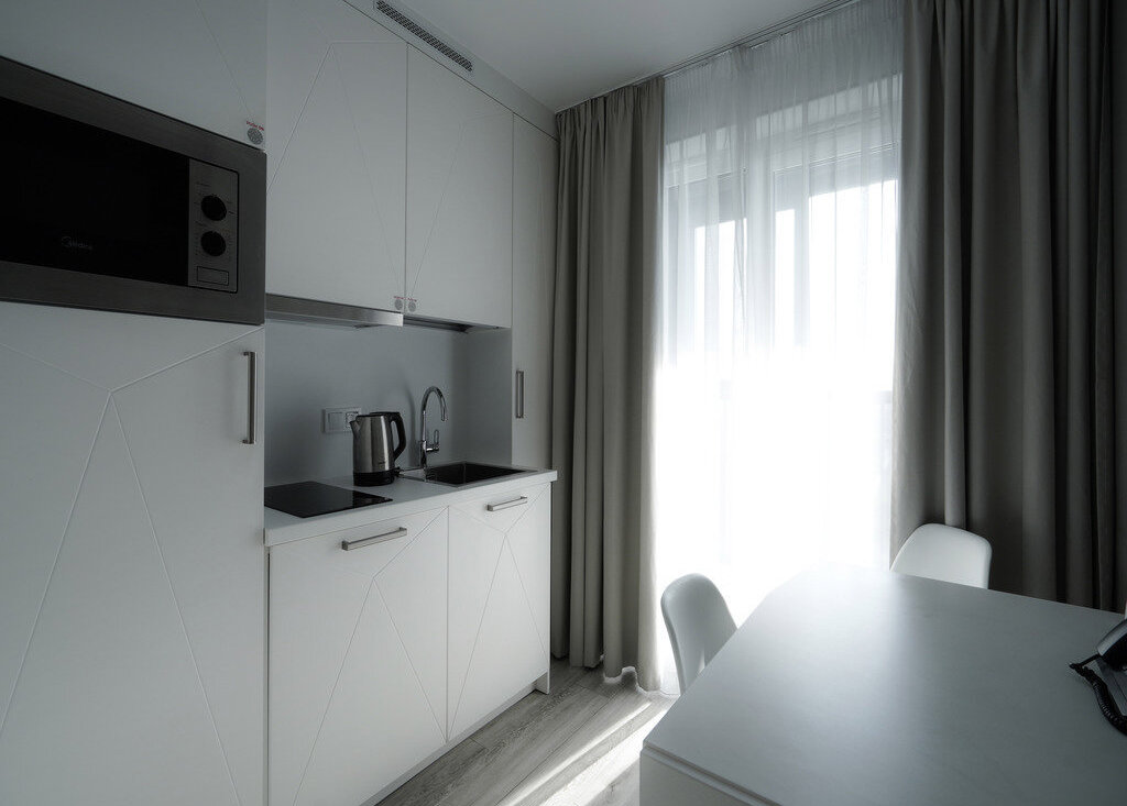 Апартаменты выполнены из экологически чистых материалов. Дизайн минималистичный в светлых тонах.