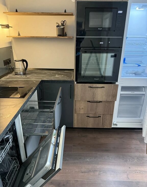 Квартира полностью оборудована встроенной мебелью, техникой (стиральная машина, микроволновка, холодильник, посудомоечная машина, ТВ), вся техника и мебель новая "ВЪЕЗЖАЙ И ЖИВИ".
