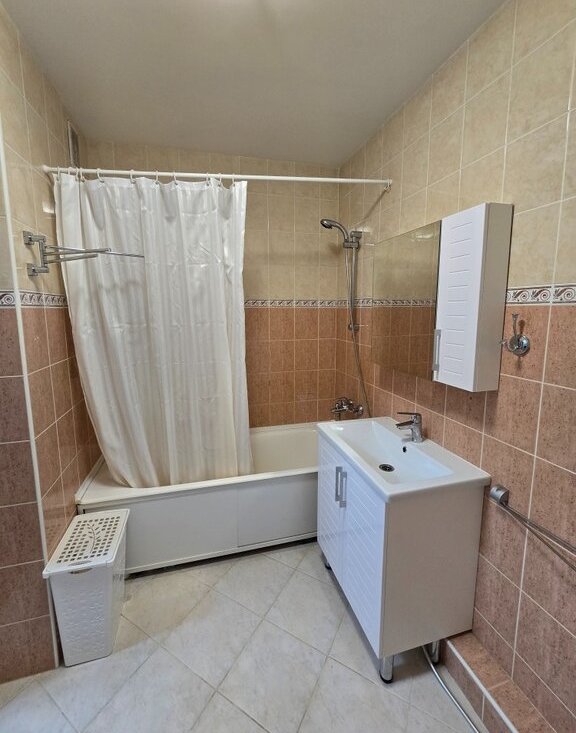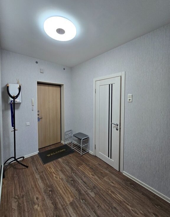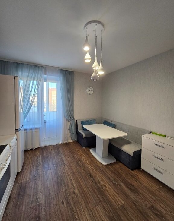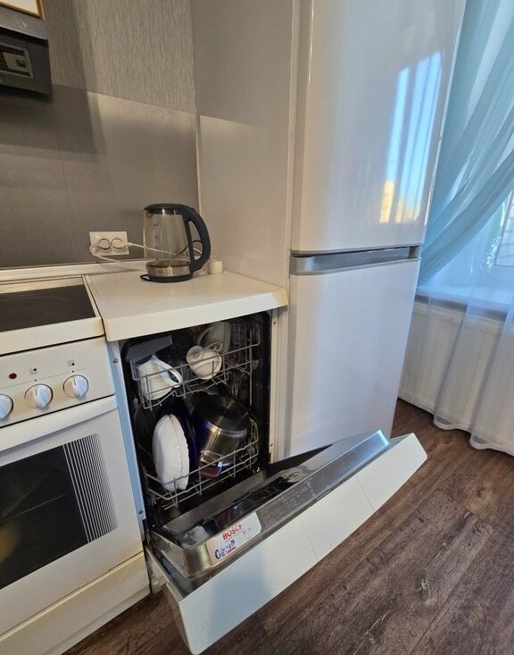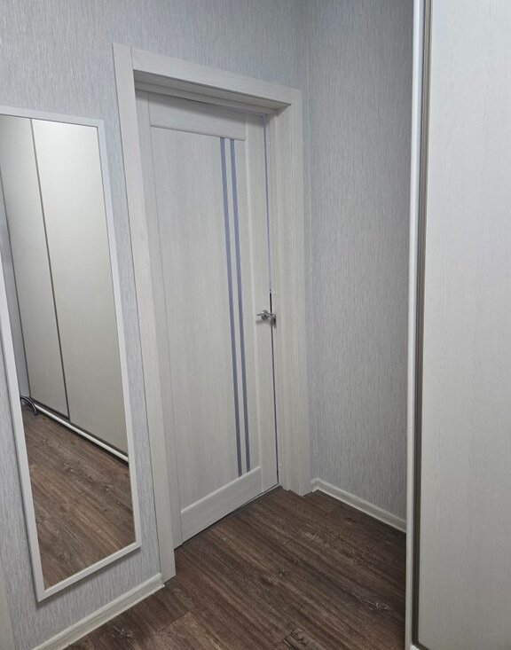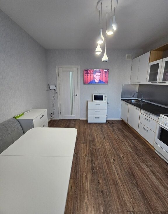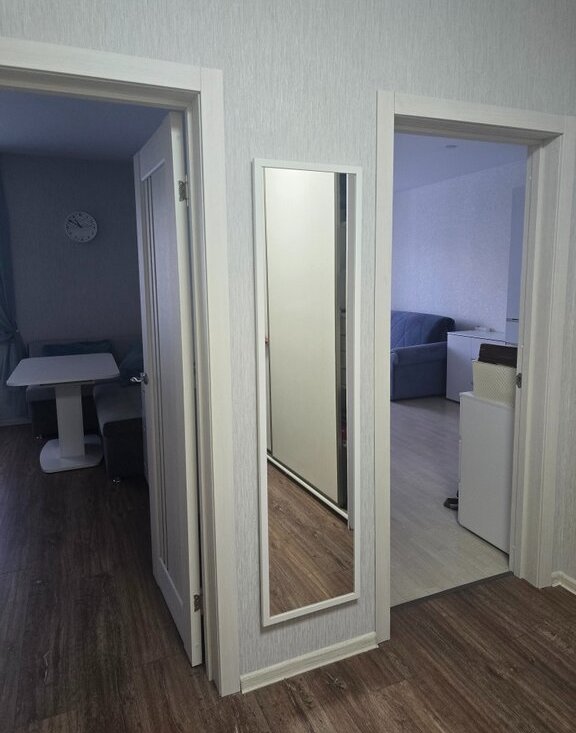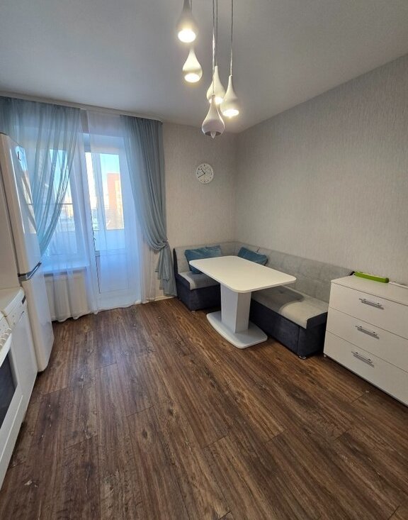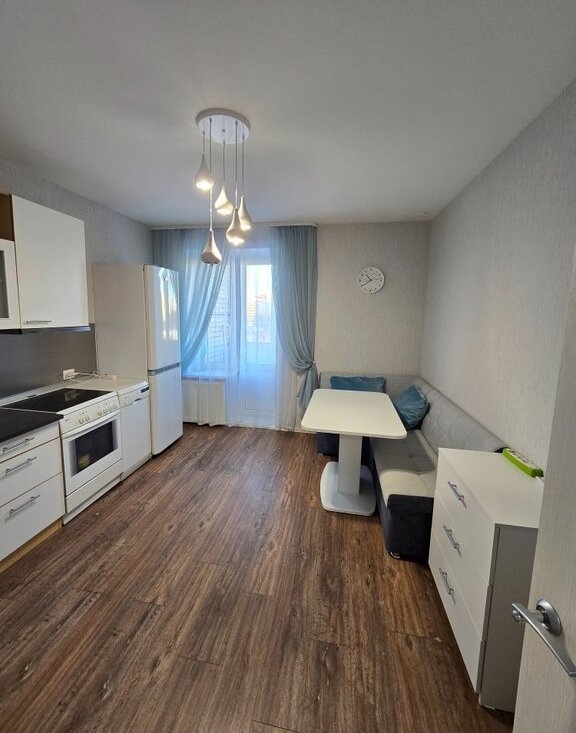 В просторной кухне- гостиной на 15м2 есть все необходимое - раскладной стол , раскладной диван , кухонный гарнитур, новый холодильник, посудомоечная машина. Кухня большая и светлая в бело- мятных оттенках. В коридоре находится огромный шкаф-купе, который спрячет все вещи.