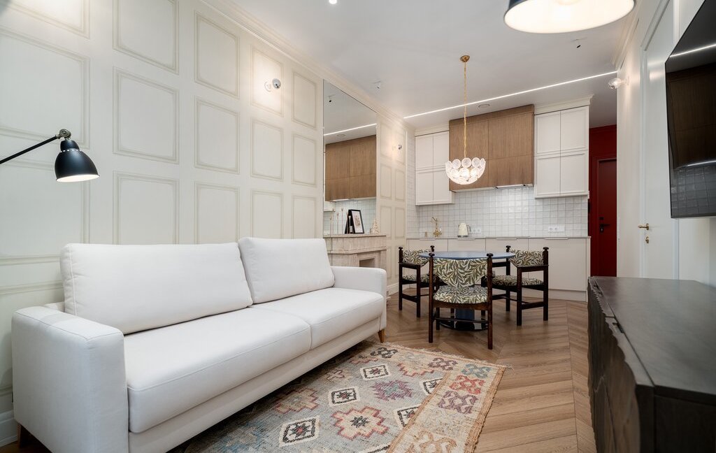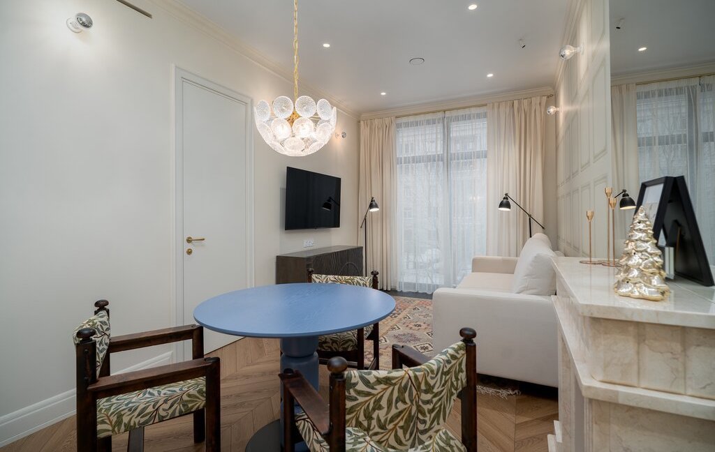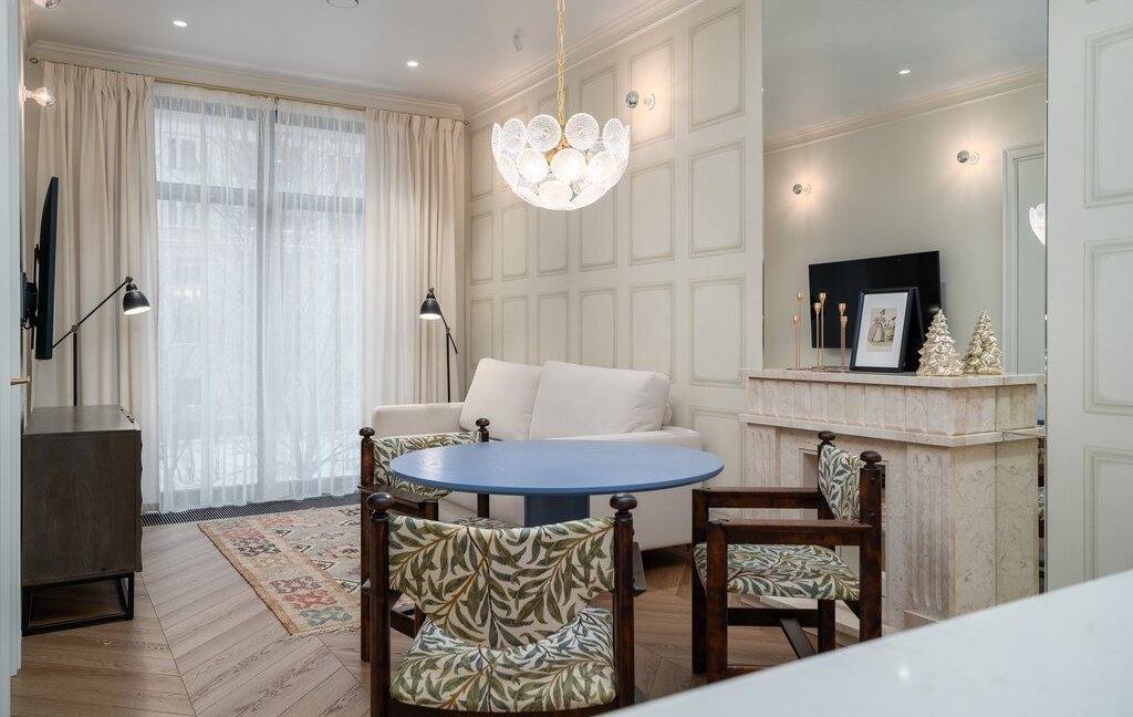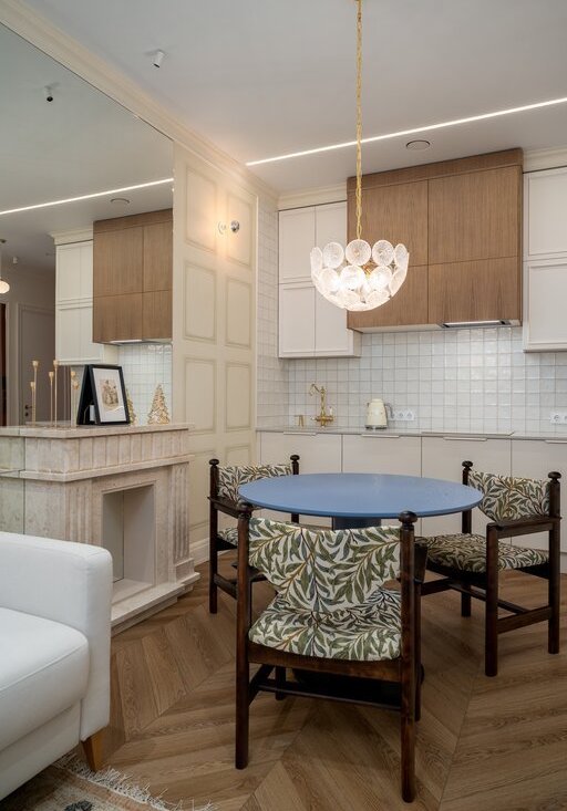 Винтажные отреставрированные стулья, мраморный декоративный камин, тёплые полы в прихожей и санузлах, кварц-виниловое покрытие пола.