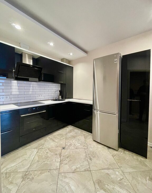 Мебель: кухонный гарнитур, кровать, стол и стулья, просторный шкаф, кожаный диван. Техника: холодильник, стиральная машина, электрическая плита, духовой шкаф, телевизор, посудомоечная машина.