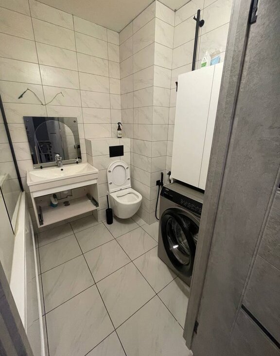 Санузел совмещенный, оснащен современной сантехникой и стиральной машиной. Лоджия добавляет дополнительное пространство для отдыха или хранения. Дом оснащен пассажирским и грузовым лифтами, а также открытой парковкой во дворе.