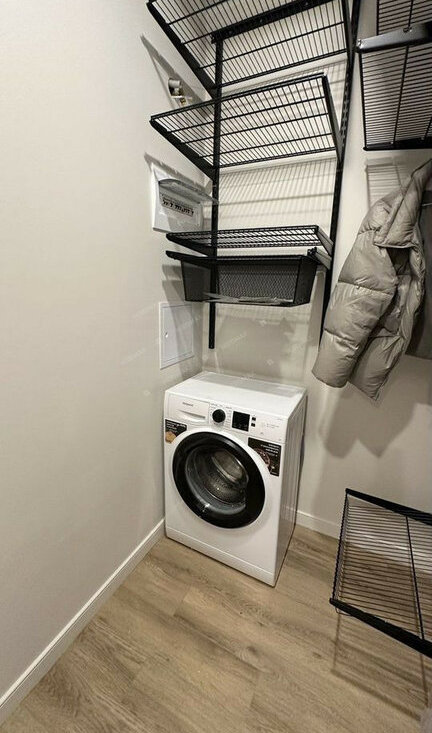 В санузле — тёплый пол, стиральная машина вынесена в гардероб, что сохраняет эстетику и удобство пространства.