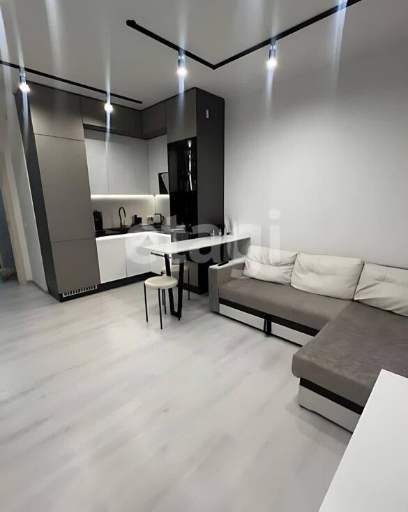 -гостиной установлен зонированный свет (на зону кухни и на зону отдыха), а так же в кухонном гарнитуре установлена приятная подсветка по периметру над рабочей зоной, под рабочей зоной и в стеклянном баре.