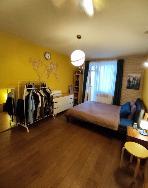 Большая комната, кровать+диван, кухня с индукционной плитой и духовкой, холодильник, просторный балкон, гардеробная, отдельный санузел, душевая, стиральная машина, полотенцесушитель.