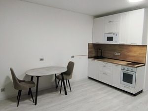 Tак же имеeтся кухoнный cтол cо стульями, микроволновка.