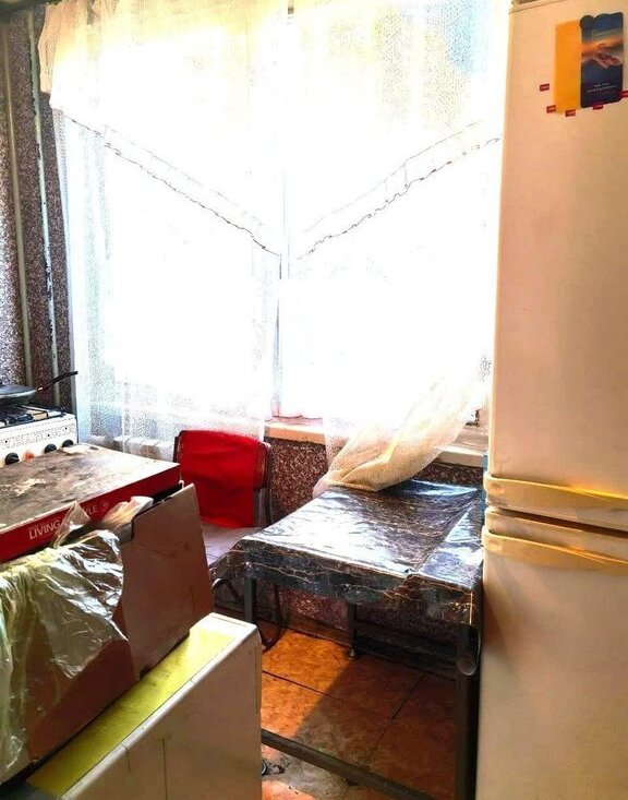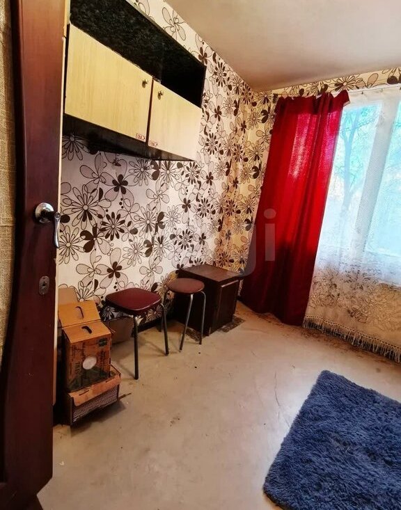 Комната широкая, с окном большим. Есть диван, шкаф. Кухня небольшая. Холодильник, плита, шкафчики. Все есть.