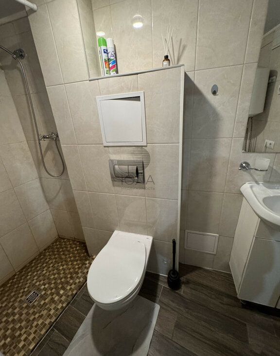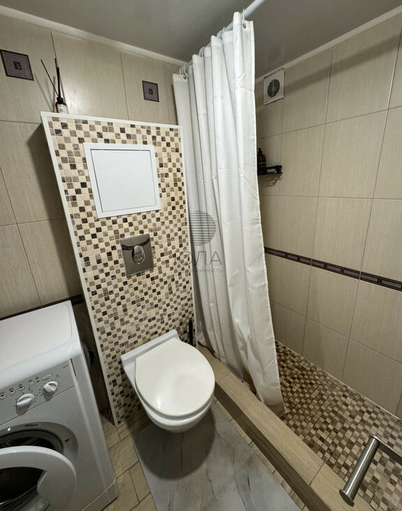 Совмещенный санузел, отделанный плиткой и удобной душевой кабиной.