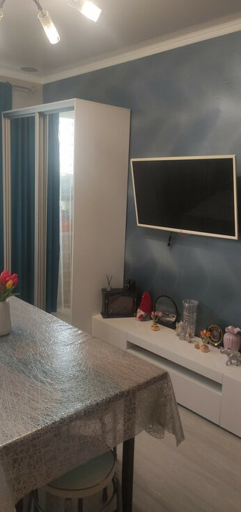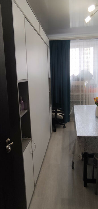 В комнате есть всё для уютного проживания: шкаф-кровать (трансформер), стол книжка, шкаф и телевизор, стиральная машина и холодильник на кухне.