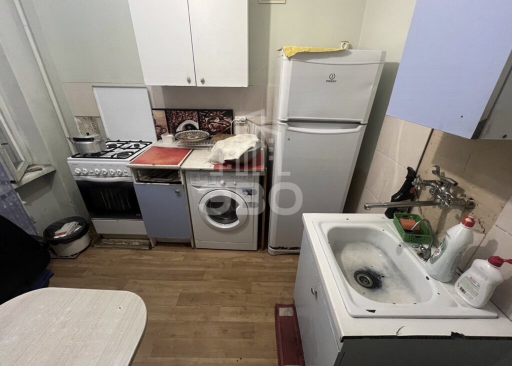 Санузел раздельный, есть стиральная машина. На кухне холодильник, стол, места для хранения.