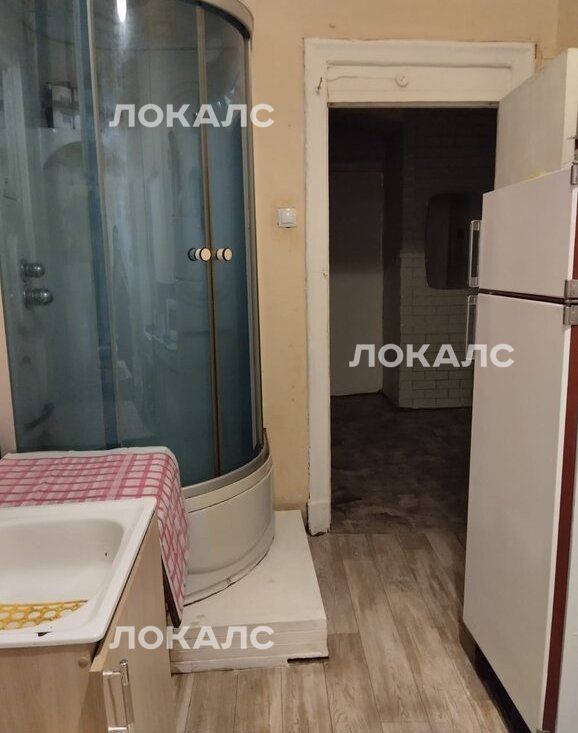 На кухне есть холодильник, плита, микроволновка, чайник, стиральная машина, душевая кабина. На двери кухни есть защёлка.