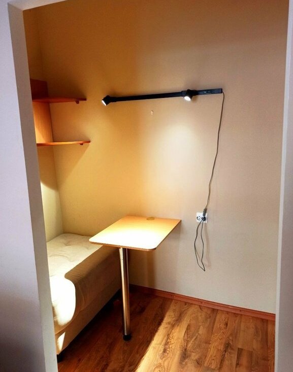 В комнате есть своя отдельная уютная зона со столиком и встроенным шкафом.
