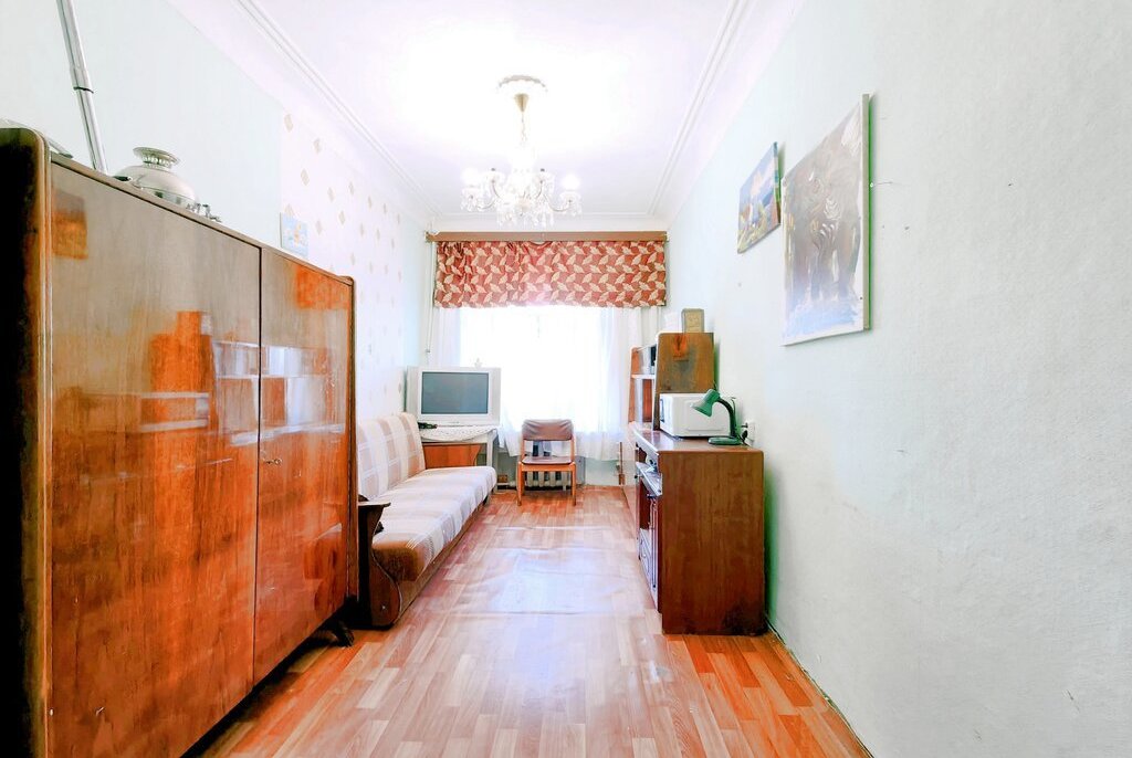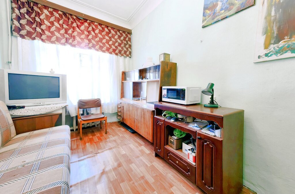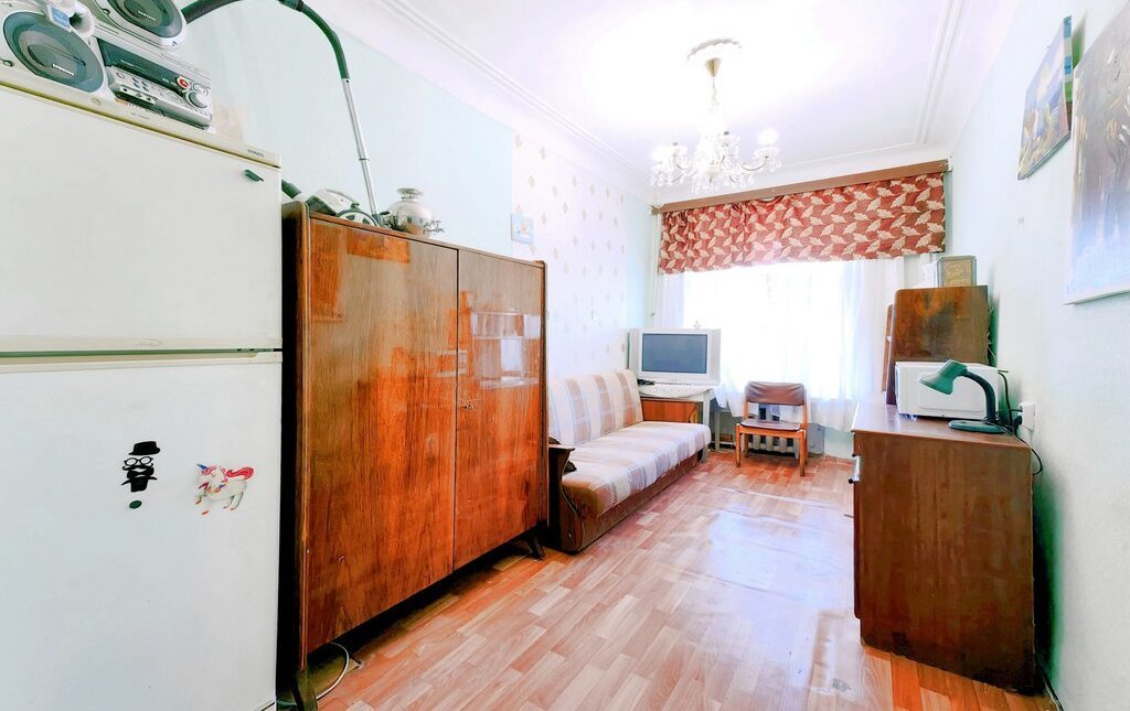 -В комнате есть: раскладной диван, стол+стулья, шкаф, комод, телевизор, холодильник, чайник.