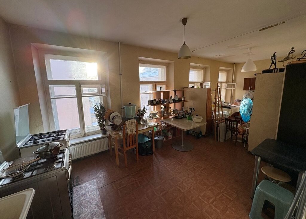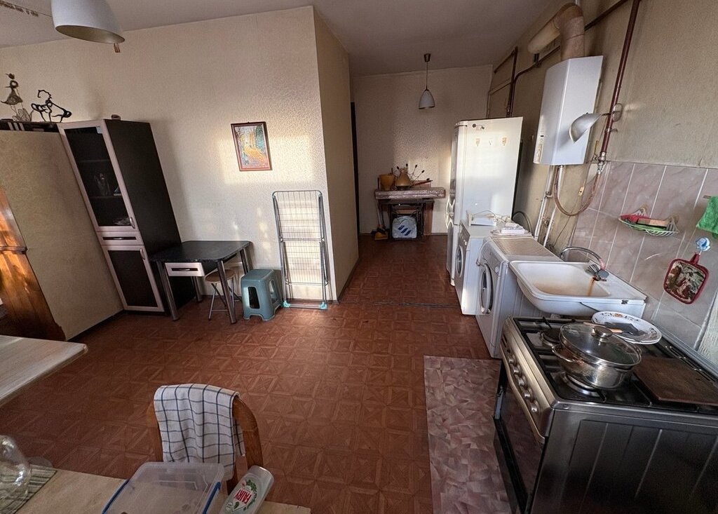 На просторной кухне (30 м2) холодильник и стиральная машина. Санузел раздельный. Этаж последний. Имеется черный выход во двор.