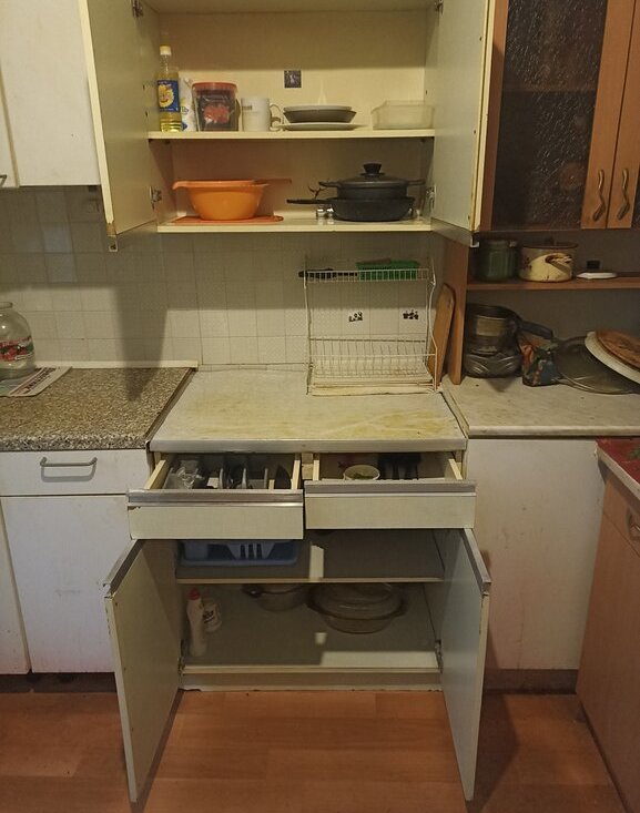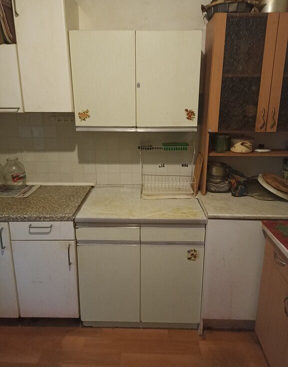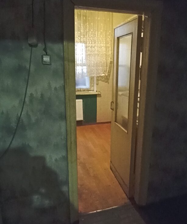 Кухня (место общ. пользования) с газовой плитой. Есть отдельный стол и полка с кухонной утварью. Места общего пользования в относительно удовлетворительном состоянии. В коридоре общий отдельный туалет и ванная комната.