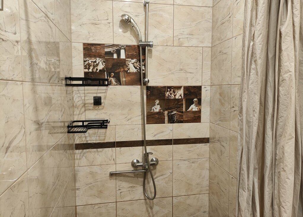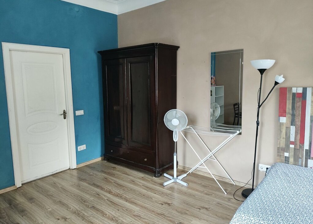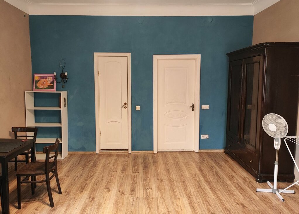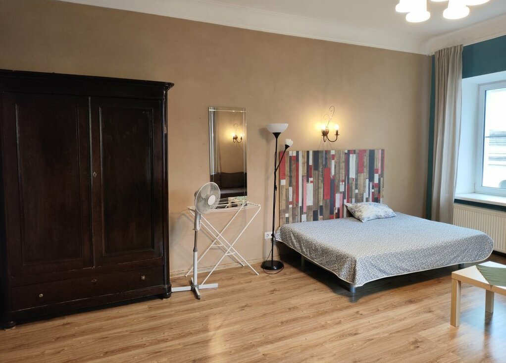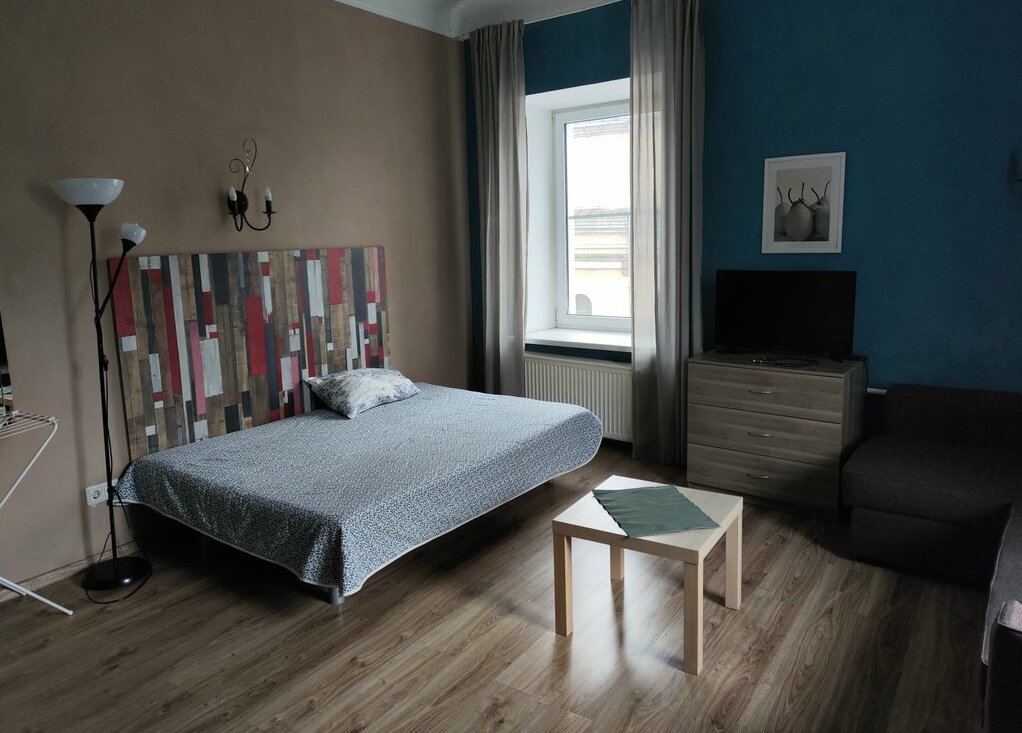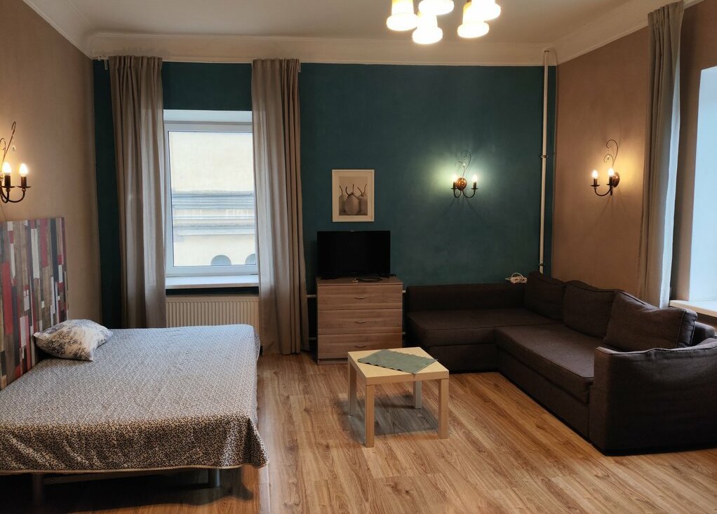 В комнате-студии двуспальная кровать, двуспальный диван, стол, комод, шкаф, телевизор, душ, туалет.