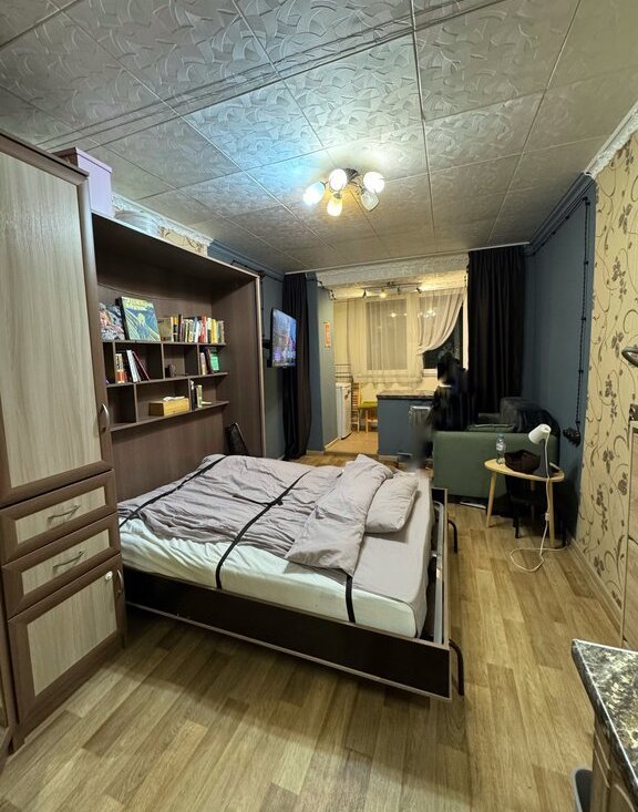 ✅ Мебель-трансформер: полноценная двуспальная кровать, которая легко убирается в шкаф, освобождая пространство днем. Также есть удобное кресло для отдыха.