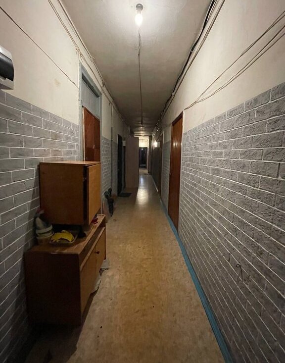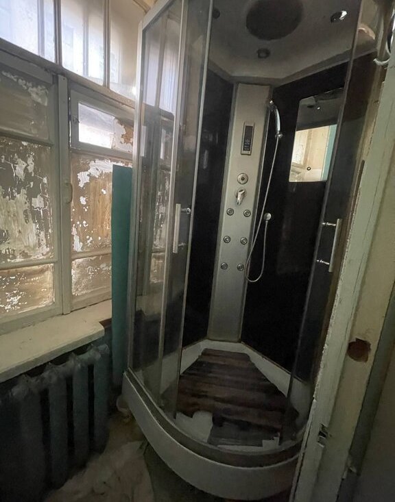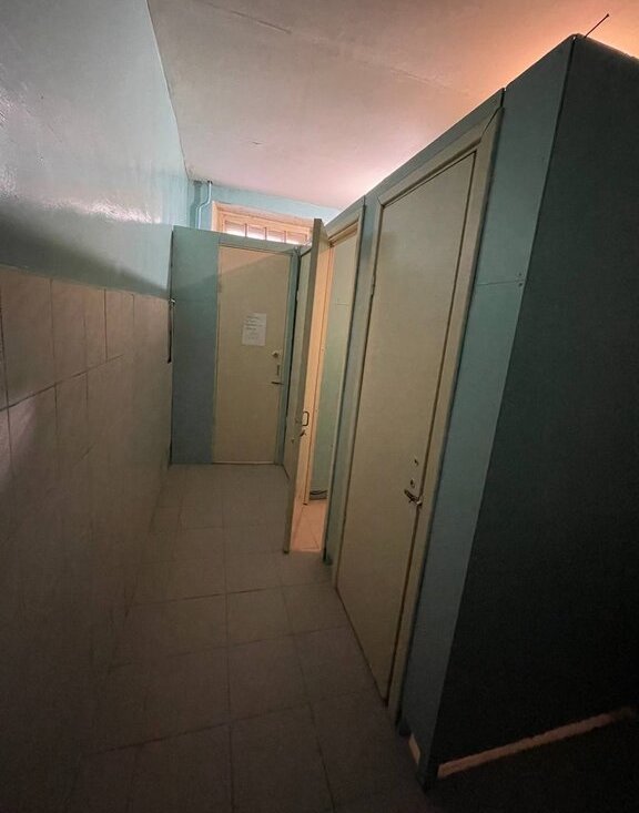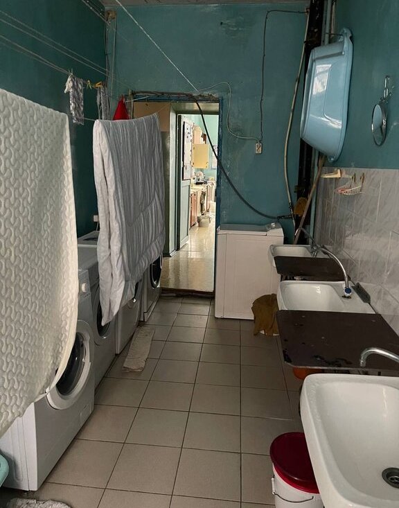 В квартире большая кухня (4 газовые плиты), 3 туалетные кабинки, одна душевая комната.