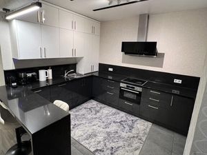 Встроенный гарнитур со всей необходимой бытовой техникой премиум-класса Siemens: духовка, варочная панель, вытяжка, микроволновка, холодильник, посудомоечная машина, теплый пол.