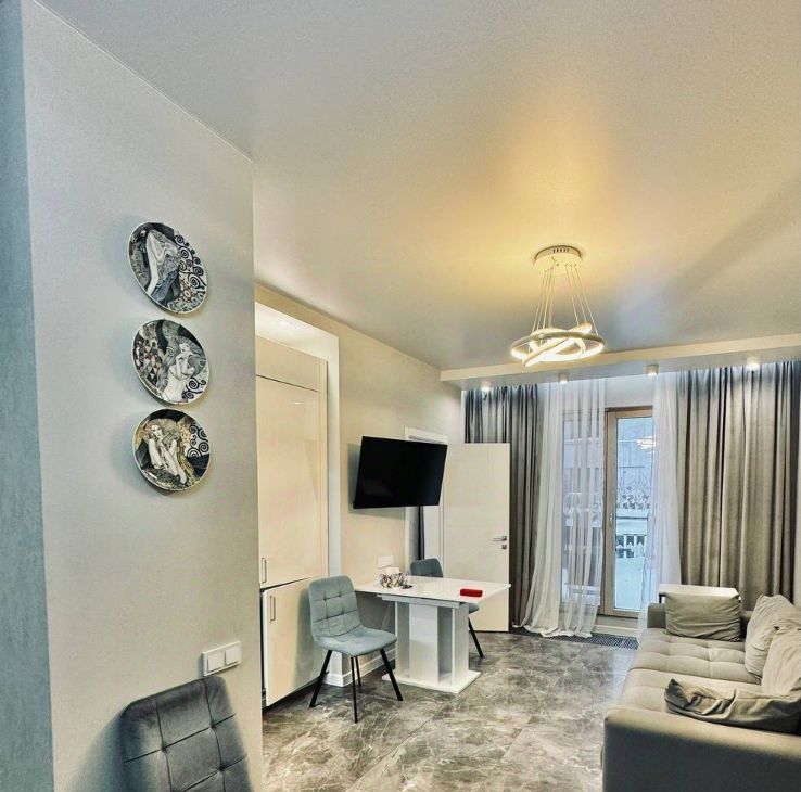 В квартире дизайнерский ремонт, встроенная современная кухня с бытовой техникой, удобный диван, телевизор. В спальне большая двуспальная кровать и большой вместительный шкаф-купе. Прямо из спальни и из кухни-гостиной выходы на террасу с просторной зоной отдыха! Современная входная группа с зоной ожидания, ресепшен с охраной, колясочная, видеонаблюдение с подключением к видеодомофонам в квартире. В доме имеется второй выход на улицу Моисеенко с детской площадкой и небольшой парковкой. Это уникальный клубный дом Veren Place. Дом получил ряд престижных премий и является лучшим образцом современной архитектуры города.