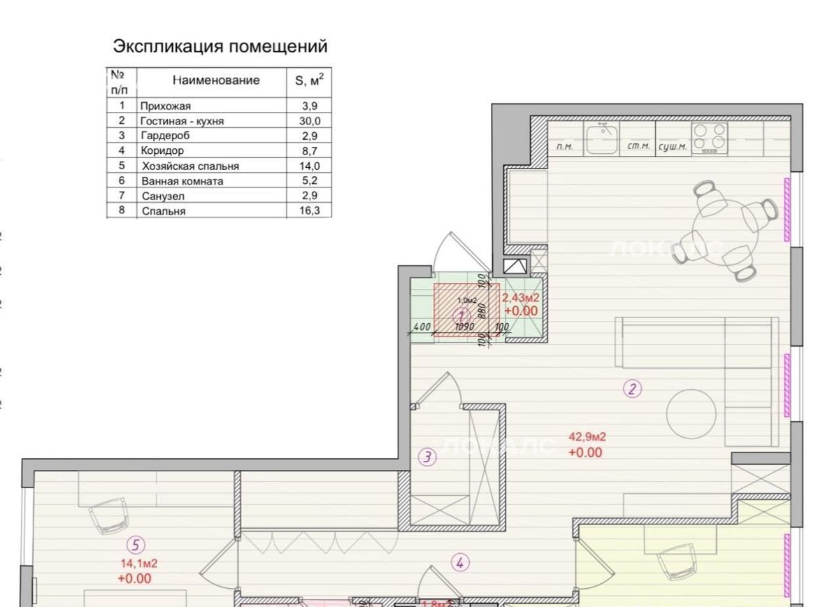 - Евротрешка площадью 87 м2: просторная кухня-гостиная (30 м2), две изолированные спальни, две гардеробные и два сан узла (в одном окно)