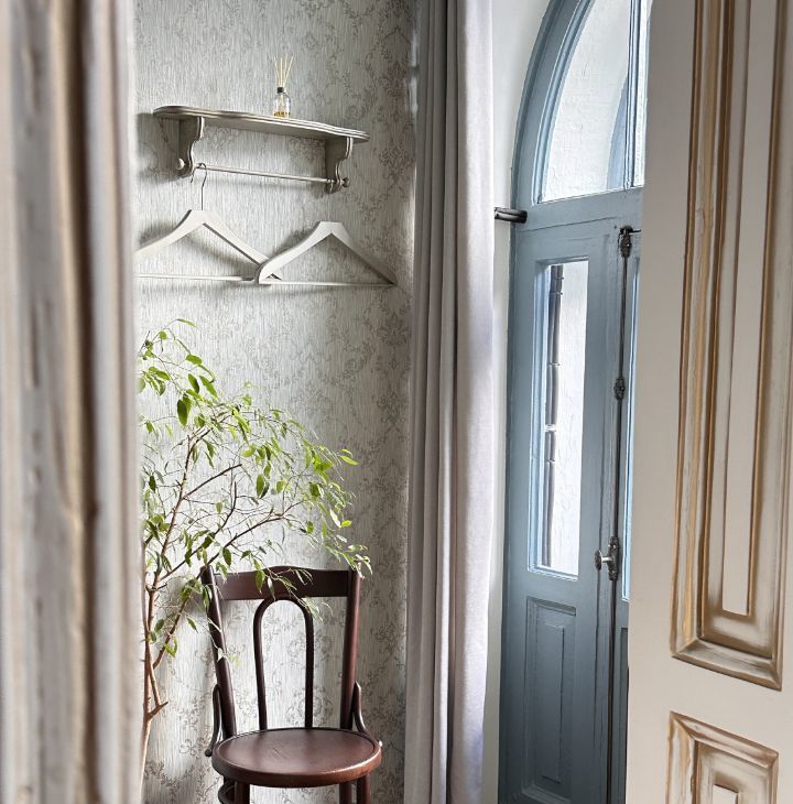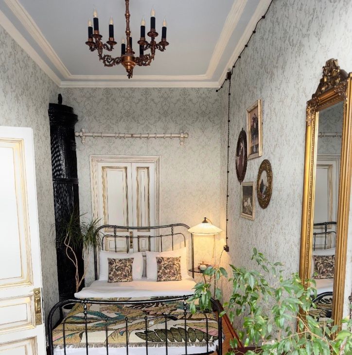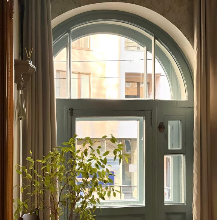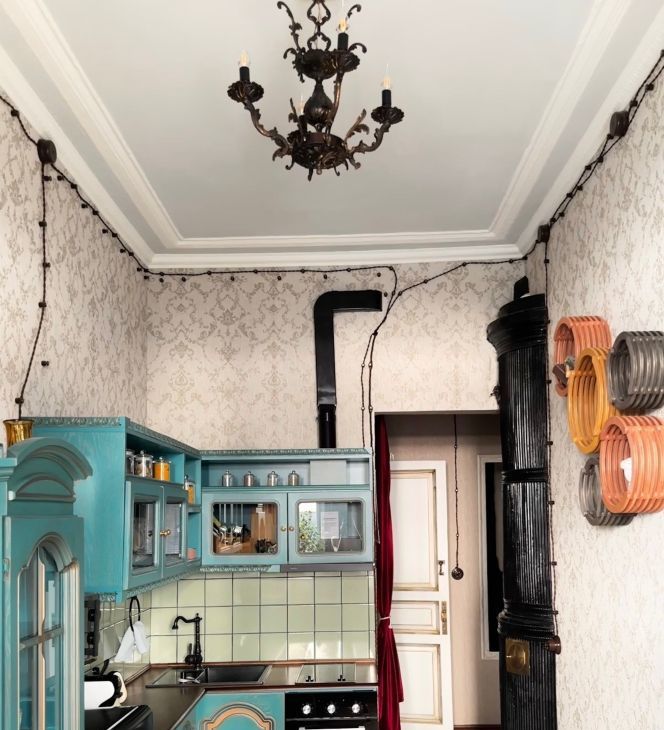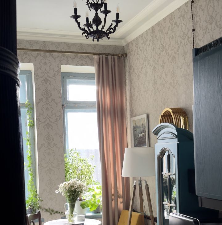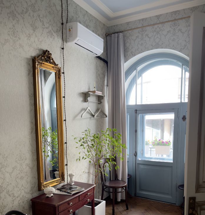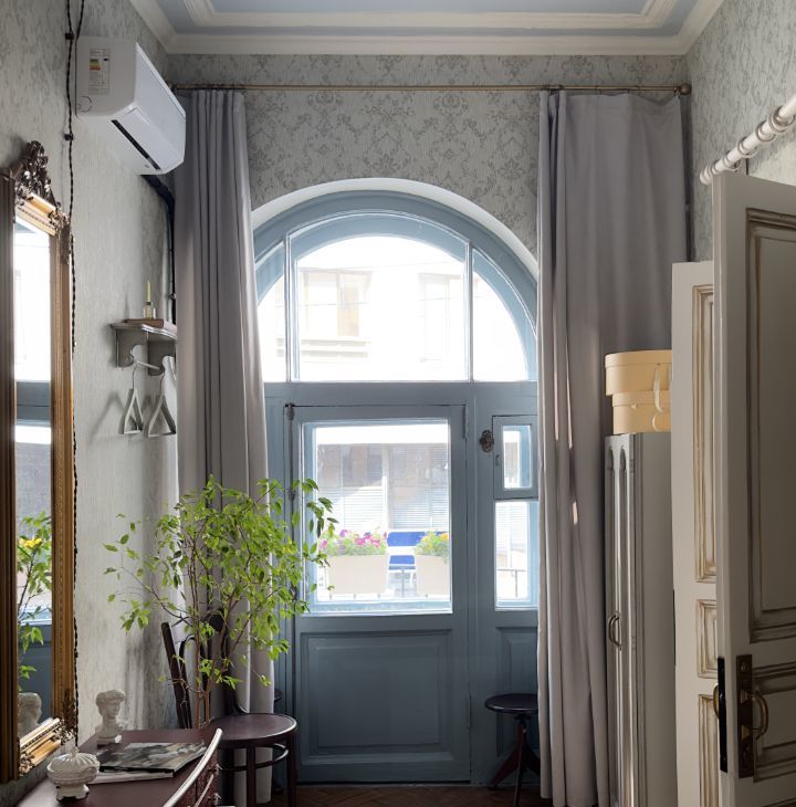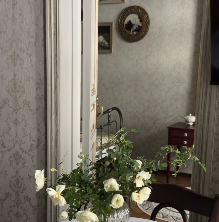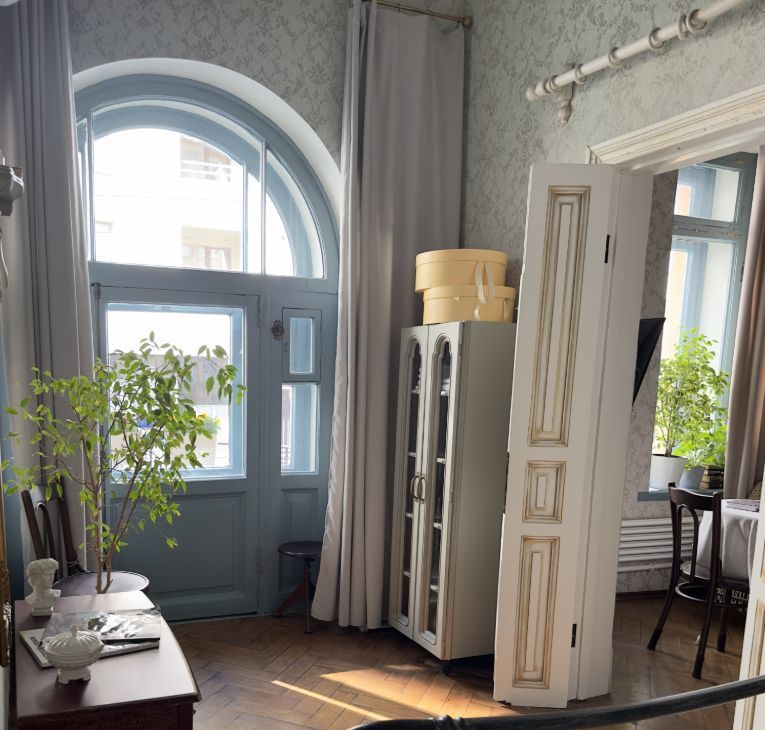 Квартира сочетает историческую эстетику и современный комфорт. Сделан ремонт с восстановлением исторических деталей: дубовый паркет, двухстворчатые двери, чугунные кремоны на окнах, лепнина, действующая печь. Имеется арочная дверь на балкон прям из спальни.