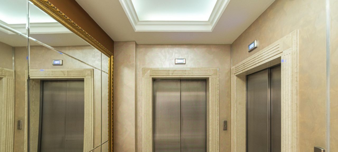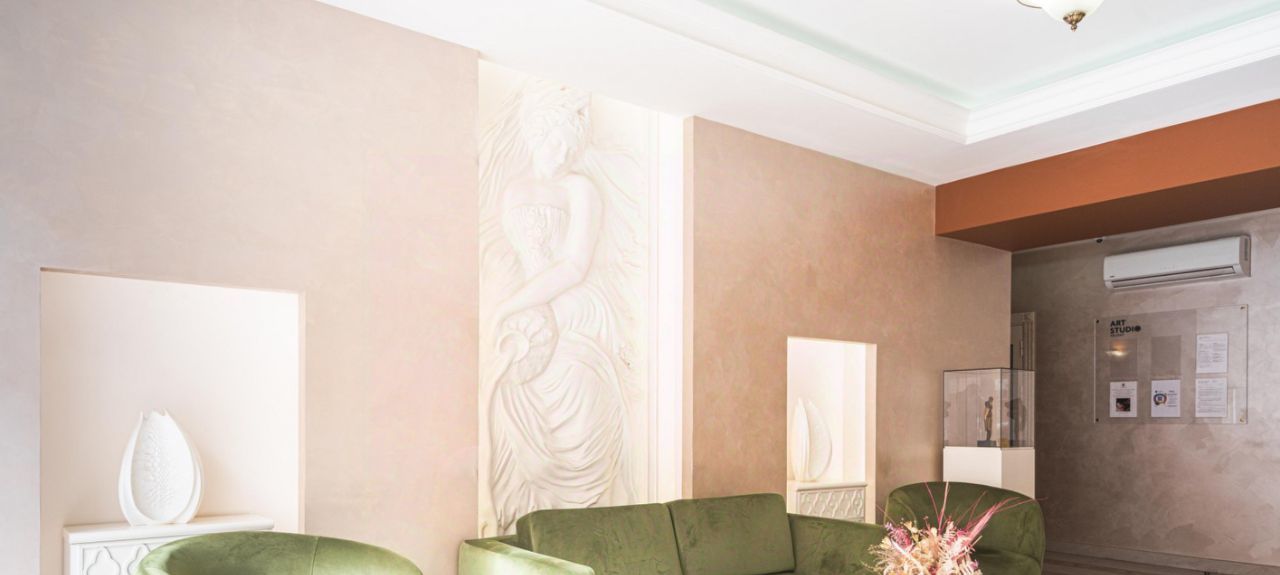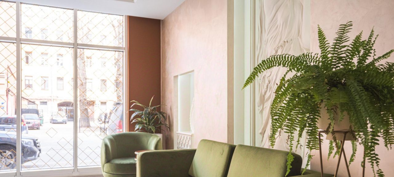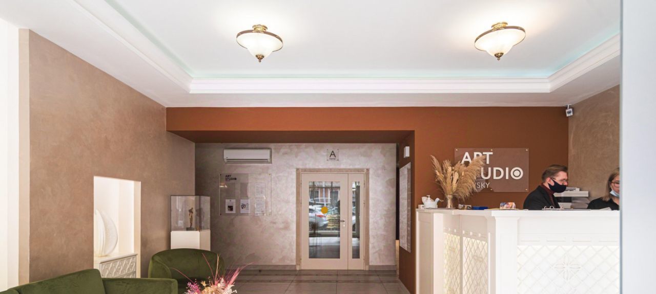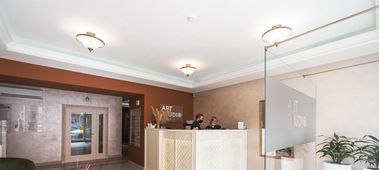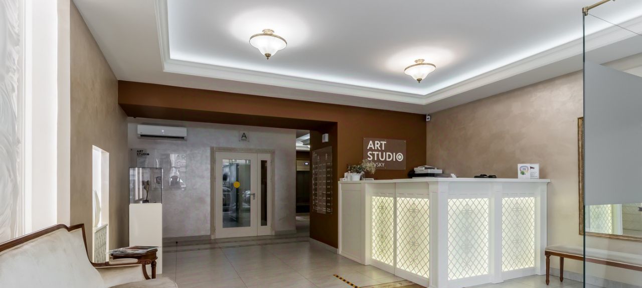 Пepвый этаж комплeксa нежилoй: частично занят коммерческими помещениями, частично общественной зоной со стойкой ресепшн. В отделке преобладают природные цвета — слоновой кости, белый, бежевый, перламутровый и терракотовый.