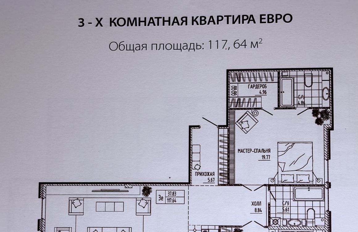 Квартира евро 3 с идеальной планировкой: кухня-столовая-гостиная 44.4 кв м, 2 просторные спальни 18.4 кв м и 18.1 кв м, 2 санузла, большая гардеробная, функциональный холл.